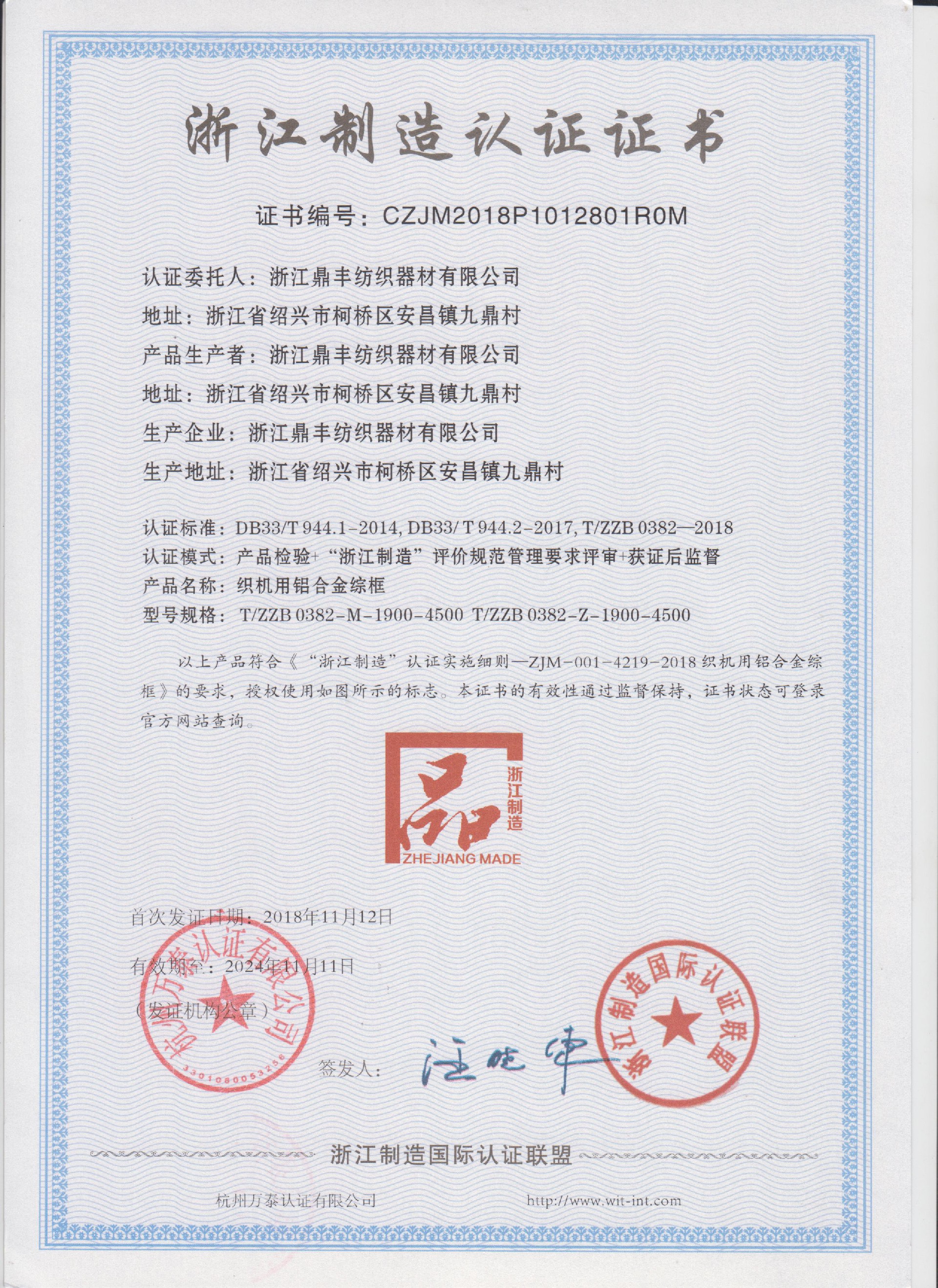 浙江鼎丰纺织器材有限公司始建于1986年,是一家专业生产各类无梭织机用钢筘:喷气筘、喷水筘、剑杆筘、其他类型钢筘;铝合金综框、钢片综、停经片、经轴、织轴、卷布辊等产品及配件的民营企业。